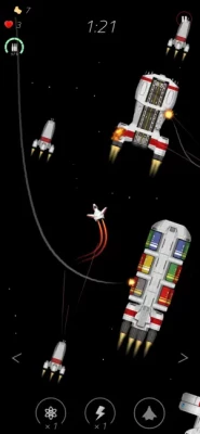 As an astronaut you can choose one of 13 different spaceships equipped with lasers, guns & laser turrets. Different spacecraft have different speed, angles of rotation & ammunition. Collect gold pieces while flying in space & unblock your favourite spaceships! Dodge missiles sent by invisible space invaders, avoid collisions with asteroids & nebulas to survive!