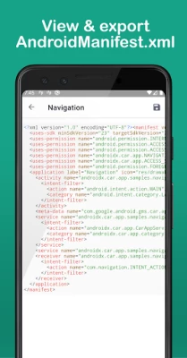 Installed apps can be saved to device storage and shared. App icon can be saved as well! App decodes the main metadata file AndroidManifest and saves it as a readable xml to an external storage.