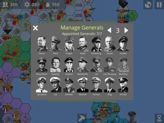 Hundreds of generals - with more coming by each update - from various countries around the world. Generals are not tied to specific units; they can be sacked from a unit on the spot and be replaced at any time.