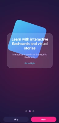 Swipe through curated cards featuring famous paintings, sculptures, and artists from the Renaissance to Modern Art. Each card includes artwork details, artist bios, and fascinating stories behind each piece.