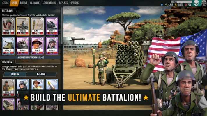 • Lead troops into real-time combat against players from around the world • Build the ultimate Battalion and destroy the enemy’s defense • Earn Supply Crates and unlock new Units to open up new tactics and strategies • Battle across vast deserts and frozen landscapes. Unlock new Theaters of War as you conquer enemies • Form an Alliance to exchange Units and spar with your friends