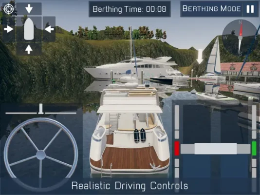 - Drive and berth a motorboat or superyacht (see screenshots) with 2 engines and bow and stern thrusters, using either berthing controls which allow access to all thrusters and easy individual engine control or driving mode which provides a steering wheel and individual or simultaneous control of both engines.
