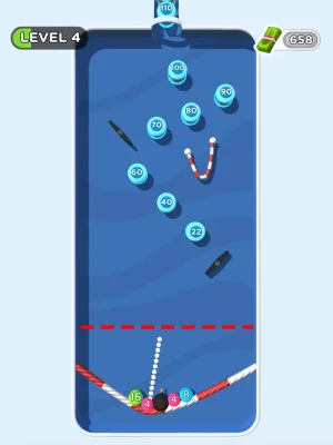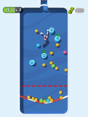 Pull the rope down, collect balls and throw them to destruct bounce buttons and get balls from them