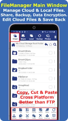 DriveHQ FileManager can manage both local and cloud files. You can easily navigate to different folders, upload or download files/folders between local and cloud. It supports regular features like Copy, Cut, Paste, Delete, View and Edit, and advanced features like backing up photos, videos, files and folders to the cloud, and sharing files with granular access control.
