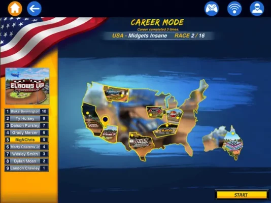 Career Mode: Race your way from the United States to Australia in a grueling 108-race mode, in which you must win each series to advance to the next. Simple, win and you're in. Be an outlaw to win your way through the ranks from Midgets, and Big Block Modifieds up to Full Blown 410 Wing Sprints, and unlock rewards!