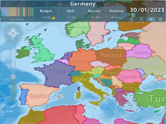•Expand your territory by military occupation to gain more power, but do not spread too thin too fast or your empire will crumble even faster. •Analyze and manipulate diplomatic relations to invade countries while avoiding creating too many powerful enemies. •Use your country's resources to sustain your research and military campaigns, but if you spend too much your land will be impoverished and you will fall behind your rivals in the balance of power. •Determine your country's economic policy and reach a high economic growth, which might allow you to outpace your rivals in the power race even without using military force.