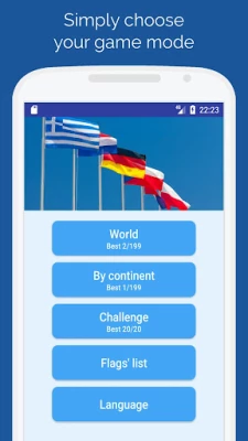 - Several game modes are available: world quiz, quiz by continent... - And a challenge to test your eye for details! - You can review and learn the flags of all the countries using the list mode. - It contains the flags of 199 countries. - The proportions of the flags are respected. - It is user-friendly.