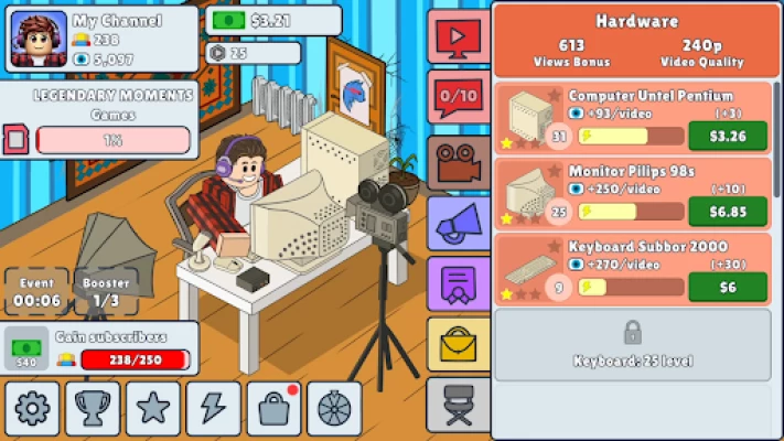 In Idle Vlogger: Tuber Simulator, trends are constantly changing. Adapt your strategy to match viral challenges and discover what your audience loves. Upgrade your camera, lights, editing tools, and backgrounds to produce better content and climb the charts.