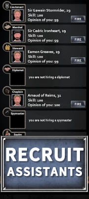 - Recruit knights, spies, and advisors to strengthen your rule.