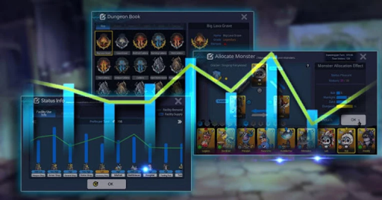 Player manages 'Battle, Exploration, Station, Monster' systems and fosters more than 400 companions with 30 kinds of the job such as Archer, Shield Knight, Mage, Adventurer, Healer, Blacksmith, Toolmaker, Treasurer, Tax collector, Glacier explorer, Mountain explorer.