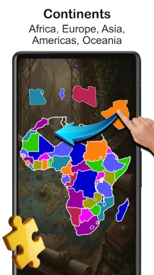 Fit countries together to complete maps of Americas, Europe, Asia, Africa, Middle East or Oceania.