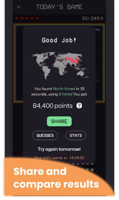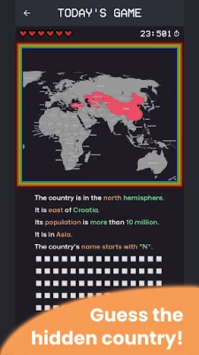 - Today's Game: Each day, there's a new country to guess for everyone around the world. Use the hints and move around the map to figure out the correct answer!