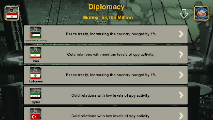 Become the Supreme Commander of the Middle East in this immersive strategy war game. Select your nation (Egypt, Palestinian Authority, Iran, Lebanon, Syria, Turkey, Jordan, Iraq, Kuwait, Saudi Arabia, United Arab Emirates, Yemen, Oman, Qatar, Bahrain, Cyprus, or Israel) and battle against intelligent AI enemies.