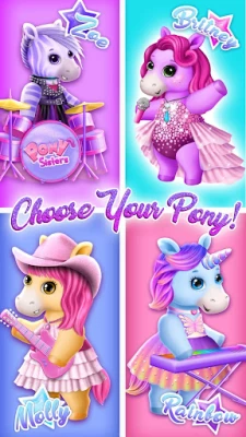 Help your virtual pony friends Rosie, Zoe, Britney and Rainbow look perfect for the tonight's pop show. Sing kids songs and play with the best pony sisters pop music band!