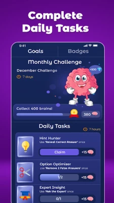 Log in daily to complete tasks, collect brains, and unlock exclusive rewards. Build your streak and maximize your bonuses, making Quizville the ultimate trivia games for free experience and iq test.