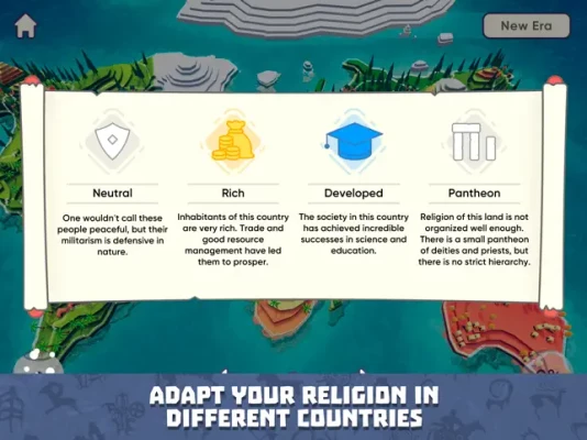 Humanity has always felt an irresistible need to believe in something greater than ourselves. It has sought comfort in the darkness—a light that would illuminate their path through the fog of millennia. For millions of people throughout the ages, this light has been and remains faith. Religion has become the beacon that has allowed many to find meaning in this universe, withstand the storms of change, and reach the shores of happiness. There are many religions in the world, each responding to the challenges of the times and changes in its own way. But how else could this process have unfolded? What other diverse and intricate forms have human beliefs and convictions taken? You can find the answers to these questions in our new game. Create your unique religion. See how well it responds to the challenges of the times and whether it can withstand trials and bring humanity to unity.