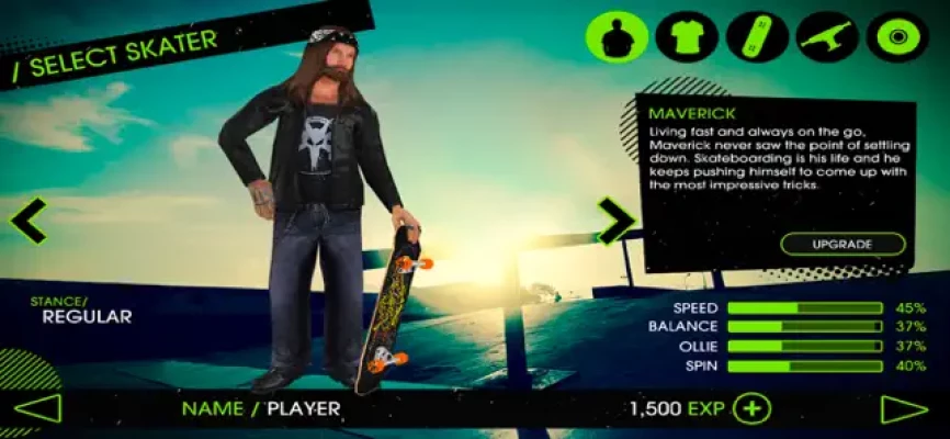 •Play often to gain experience and upgrade your skater’s attributes.