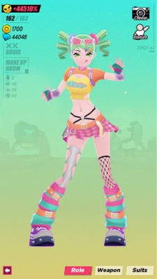 Dress Doris up! We designed various suits and weapons which allows you to match them to your own taste. Share them through social media!