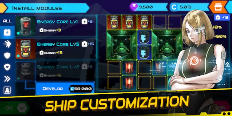 - Equip ships with weapons/energy/defense modules, etc.