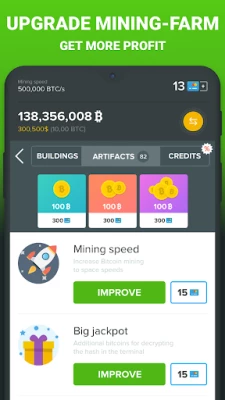 There are over 400 different upgrades and artefacts in the game to help you mine bitcoins(game currency) and shovel your cash. Improve your click power, passive earnings and level up your cryptocurrency business.