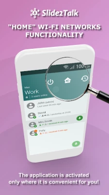 The Slide2Talk (Slide To Talk) is a walkie talkie online, voice communication for home and office. The application allows you to instantly exchange voiсe messages viа the сloud or directly on WiFi networks (even offline without the Internet). The Slide2Talk works as a two way radio (walkie-talkie) with PTT (Push To Talk) function. Incoming audio data are automatically played through the speaker or headset.