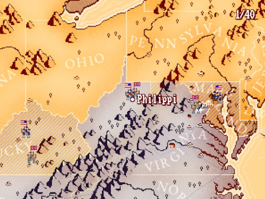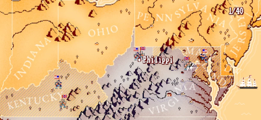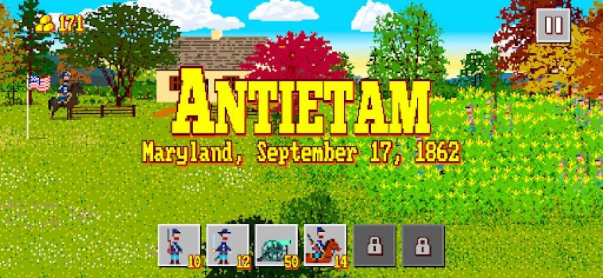 Retro Visual Style and Music: Experience the American Civil War through vibrant pixel graphics, filled with color and detail, accompanied by classic Civil War-era tunes including "When Johnny Comes Marching Home" and "Battle Hymn of the Republic."