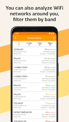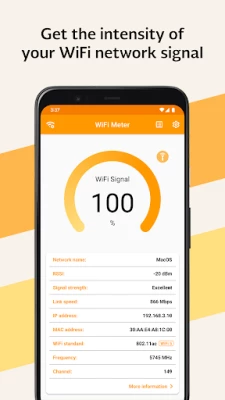 Obtain the signal strength of the WiFi network to which you are connected and the WiFi networks that surround it. This is useful so you can find good areas to connect to WiFi networks. In addition to the signal strength of the WiFi network, other relevant features can be observed, such as the MAC address, the WiFi network security, BSSID, etc.