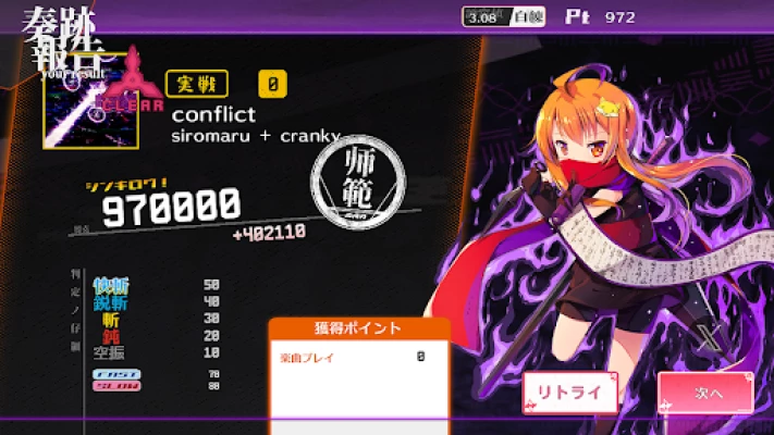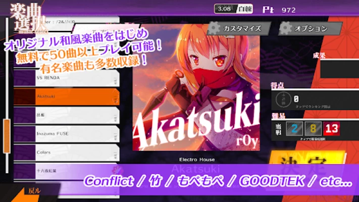 オリジナルの和風楽曲に加え、あの「conflict」や「竹」、「GOODTEK」、「もぺもぺ」などの有名音ゲー曲も収録!タップとフリックを駆使し、お気に入りの楽曲でハイスコアを目指しましょう!!