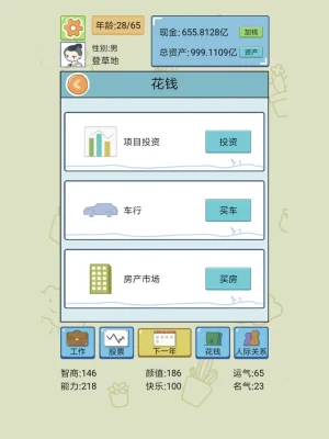 这是一个人生模拟游戏,你可以选择自己的游戏方式,自由自在想做什么就做什么。在游戏中可以投资炒股,买车卖车,买房卖房,开设餐饮公司,创办游戏公司,竞选商界领袖,开启火星殖民计划。