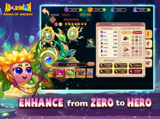 Adorimon offers a wide range of species, each with its own distinct characteristics and personality. You can level them up, evolve them, learn dozens of special skills, and enhance their power. Notably, you can even summon ancient legendary creatures, harnessing their immense strength.