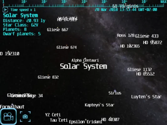 Besides simulating space flight, this app can also be used as a planetarium, with all known planets shown in real scale with their accurate keplerian orbits. It can also be used as a star chart and exoplanet explorer, showing all solar systems with confirmed exoplanets within 50 light years from the Sun.