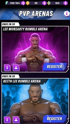 Daily missions: Complete objectives like PvP challenges to earn valuable rewards that keep your wrestlers in top fighting form and upgrade their rating card.