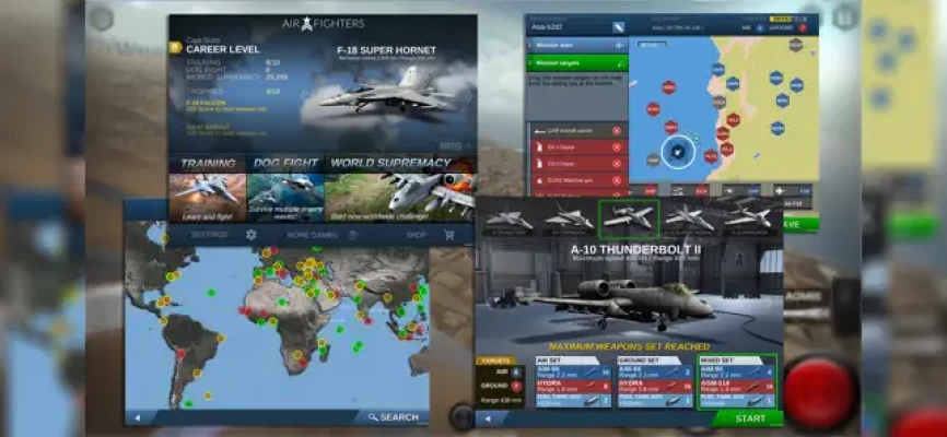 Train and get ready to combat. Test yourself in World Supremacy, where you will take part in the best missions published worldwide. Become a flying ace in Dog Fight, where you will face ever stronger enemy jets: 6 game modes to become a top gun. Unlock new increasingly powerful weapons for each aircraft.