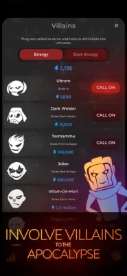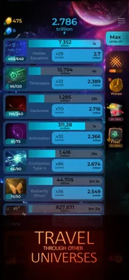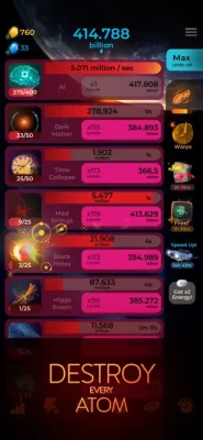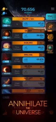 This is an incremental idle clicker game where you will earn two types of energy - regular Energy and Dark Energy, explore universes in the whole Multiverse, annihilate every atom, and upgrade Disasters. New adventure is waiting for you.