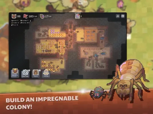 In this game, you play as an ant queen, growing an ant colony. Ants cannot be controlled directly. But you can spawn needed types of ants; upgrade them; make raids and most importantly - dig and build a dungeon! The goal of each location is to destroy all enemy bases. If the queen dies - the game ends.