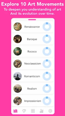 Our app covers several key art movements in chapters giving you a comprehensive understanding of art history. You’ll study the most famous paintings of Impressionism, Realism, Renaissance, Baroque, Romanticism, and Rococo art movements. You'll learn about the different styles, techniques, and themes that have defined art throughout history and understand the contexts that inspired the world's greatest artists.