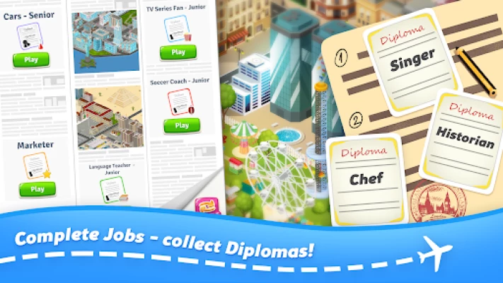 Answer trivia questions to unlock the landmarks of the city and buy amazing souvenirs: Each city presents its set of trivia questions to answer and jobs to complete. Correctly answer questions to unlock new landmarks and souvenirs. The more questions you answer correctly, the faster you'll progress through the quiz game.