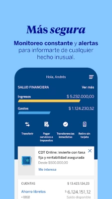 - Puedes solicitar recursos adicionales sobre tu crédito de consumo actual a través de un retanqueo de crédito, contratar un CDT, un adelanto de nómina y fondos de inversión de manera digital sin necesidad de ir a la oficina.