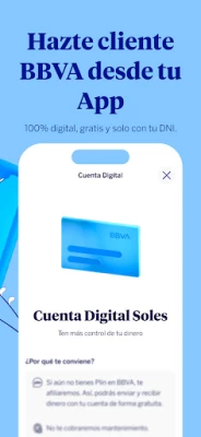 Si aún no eres cliente de BBVA, ahora puedes abrir tu cuenta digital directamente desde la app, en menos de 5 minutos, sin ir a oficina. Este nuevo flujo digital único en Perú te permite obtener inmediatamente una cuenta de ahorros digital con cero costo de mantenimiento, una tarjeta de débito digital para tus compras físicas y en línea, afiliación inmediata a Plin BBVA para transferencias rápidas, acceso completo a la banca por Internet y activación del Token Digital para operaciones seguras.