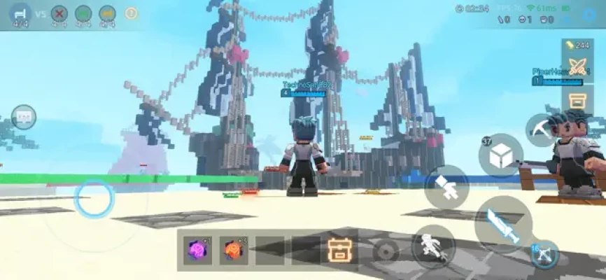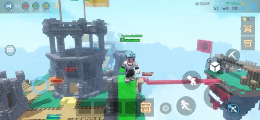 Team Work 16 players divided into 4 teams,spawning on different islands,build bridges with blocks to attack your opponents and contest the resources to upgrade your weapon and items so you can destroy your enemies' beds more easily! Get matched in seconds to compete with players from all over the world, the challenger spots are waiting for you!