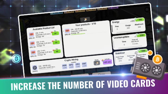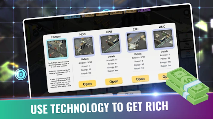 Hire and upgrade factory parts to speed up your process, earn idle cash, upgrade your rigs and mine in this simulation video game! Click and tap, then tap some more and start your BTC adventure!
