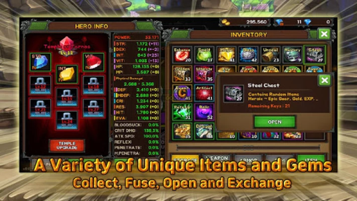 The graphics are in retro rpg style, where all the art is in pixel style. In this idle rpg game you are given to choose one of three heroes: Mage, Vampire and Hunter, but you can play and pump each one. There are many entities to pump in this idle prg: heroes, magic, armor, gems, forge, etc.