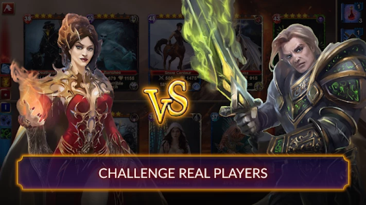 Step into a dark TCG war game. Select your clan of heroes and build a formidable deck for epic duels. Tailor characters to enhance combat tactics and summon powerful heroes. Follow your path into a mesmerizing realm of fantasy while engaging in thrilling PVP & PVE battles.