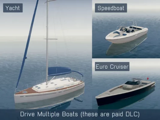- Realistic water physics with drag based on speed and realistic boat handling (now including prop walk on the yacht)