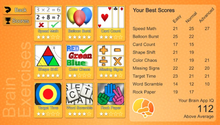 Quick-play Brain Exercises - Pick an exercise, difficulty and time setting. Challenge yourself to set new high scores, or practice without any time limits.