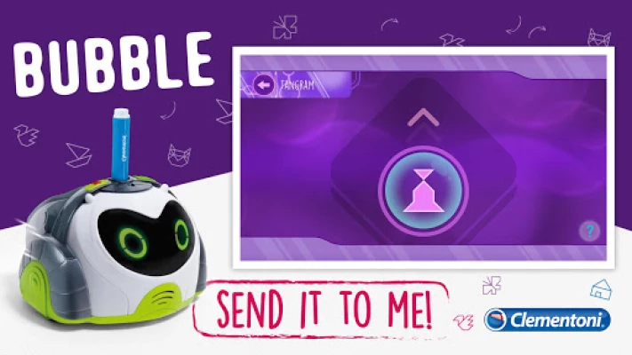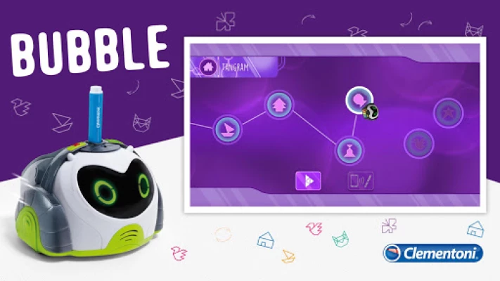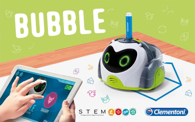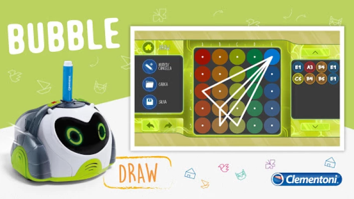 The app is divided into two areas: DRAW and TANGRAM. In the DRAW area you can practice creating and saving your drawing projects which you can then replicate through the robot. In the TANGRAM area you must compose the figures, which you can then send to BUBBLE so that the robot can draw them."