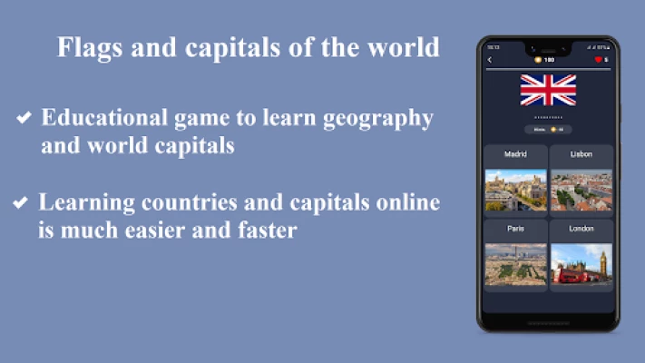 * Learn with the help of this game all capitals of the world, location on the map and flags of the countries