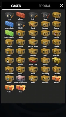 • Cases tab - this is here you unbox your weapon skins, to begin opening cases tap icon on the right and select crate you wish to open.