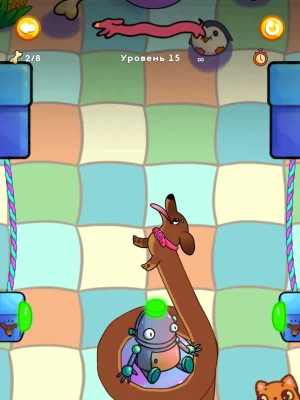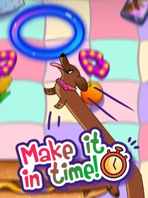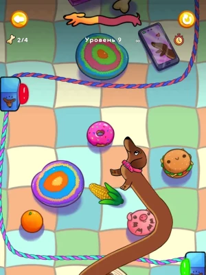 How to play: 1. Slide your finger across the screen to pull the dog; 2. On the way to the finish, collect food to increase the stretch of the dog; 3. Solve simple puzzles that will help you get to the finish line; 4. Avoid different traps; 5. Collect bones for which you get coins and the opportunity to buy special clothes for dogs.