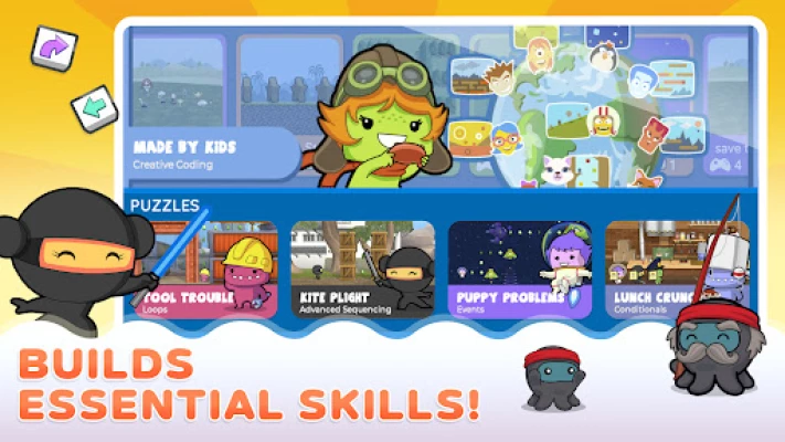 * Learn programming concepts through coding games for kids & use them to code their own games & interactive stories